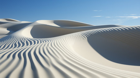 Windswept sand dunes create a mesmerizing pattern under a clear blue sky in a tranquil desert landscape. Ai generated