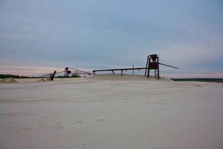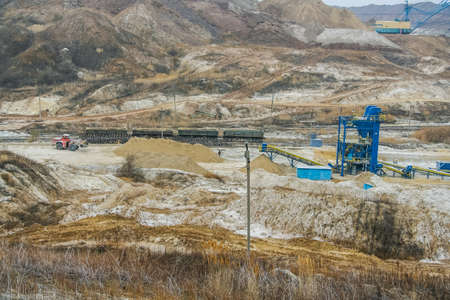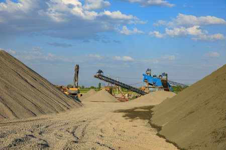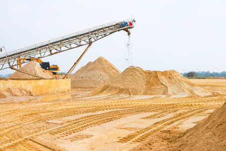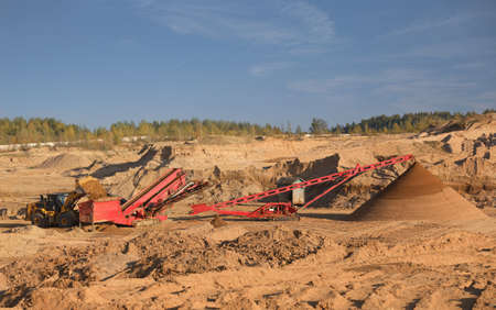 The heavy tractor works in a sand quarry. Quarry sand with a grinding machine and conveyor belt