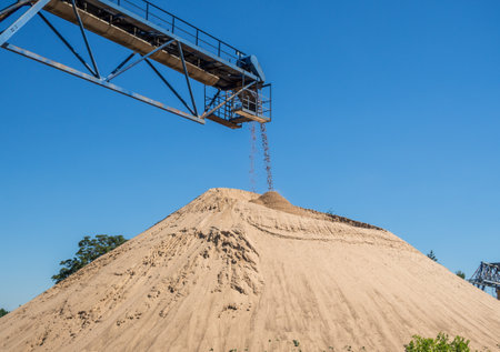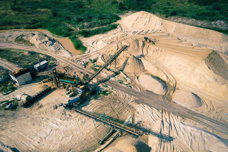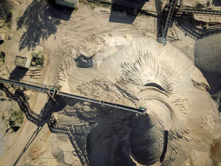 Mining conveyor at sand quarry. Aerial view of mining machinery. Mining industry