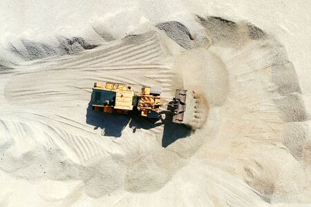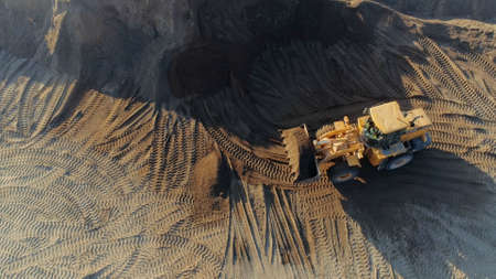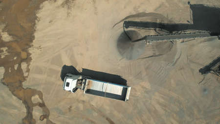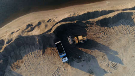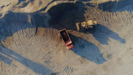 Sand mining industry, sand mine at the quarry. Scene. Aerial top view of a bulldozer machine putting sand to the truck body.
