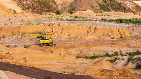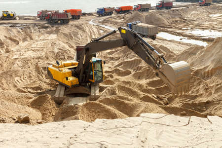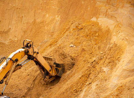 A large yellow hydraulic industrial excavator, iron bucket miners, digging and loading sand, inside the development of a large sandy career.
