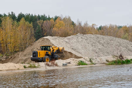 Front-end loader during digging and excavation operations in open pit. Wheel loader load the sand at quarry. Crushed gravel for construction industry. Screening and washing sand for building.