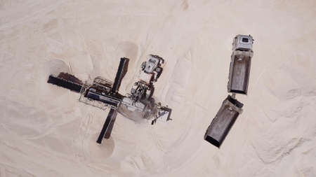 Aerial view of empty cargo truck. Excavation of natural resources. Wheel tracks on the sand.