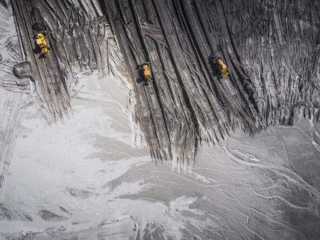 Top viw of coal mining process. Big truck for transportation coal and stones. Wet ground on the background.