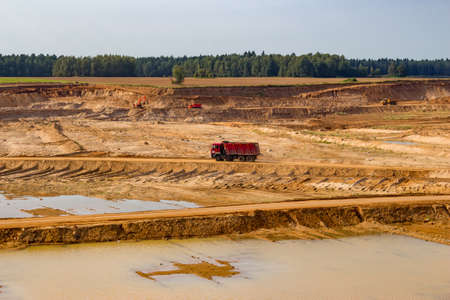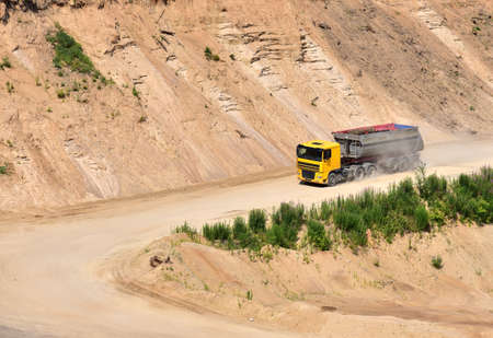 Dump truck transports sand in open pit mine. In the production of concrete, concrete for the construction using coarse sand. Quarry in which sand and gravel is excavated from ground. Mining industry