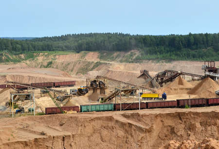 Opencast Sand quarry, industrial extraction of sand for construction industry. Excavators and tractors load crushed stone and rock into dump trucks