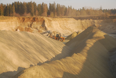 Opencast Sand quarry, industrial extraction of sand for construction industry. Excavators and tractors load sand into dump trucks