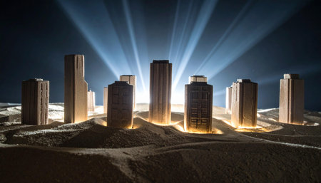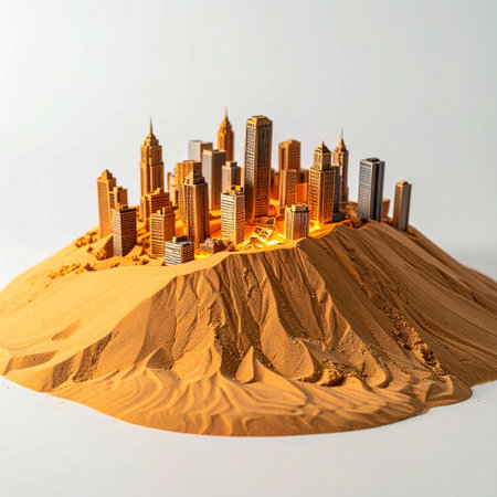 A gleaming miniature metropolis emerges from a vast dune of golden sand, its lights glowing with promise. This conceptual image represents ambition, innovation, and building a future in even the most challenging environments, symbolizing growth, real estate development, or the discovery of a long-lost civilization.