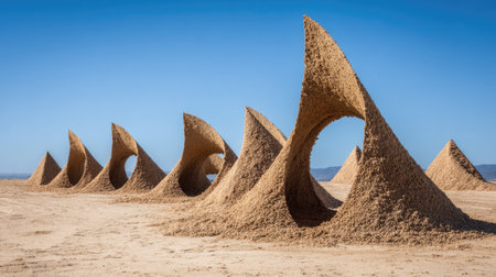 Stunning image of unique sand sculptures that resemble large cones placed on a beach. Captured under a bright blue sky, this artwork showcases creativity and minimalism.