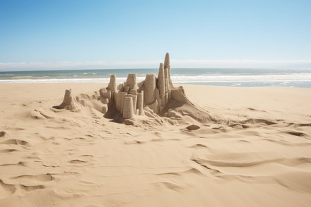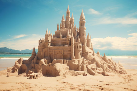 A magnificent sandcastle stands tall on a beach, a testament to creativity and summer fun.