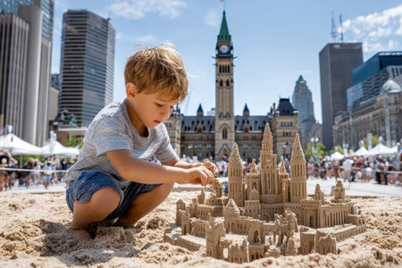 A child focused on crafting a detailed sand castle during a lively festival in the city center.