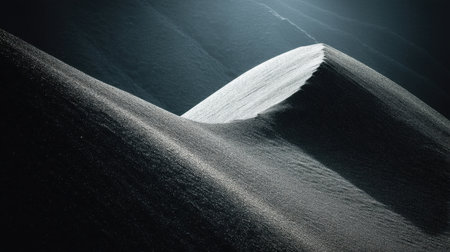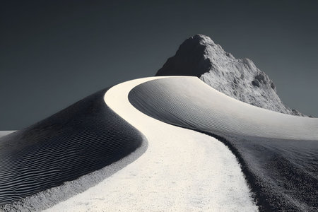 Dramatic monochrome desert scene featuring smooth sand dunes curving towards a stark, rugged mountain backdrop. the contrast between light and shadow emphasizes the natural forms and textures of the vast landscape. Generative AI