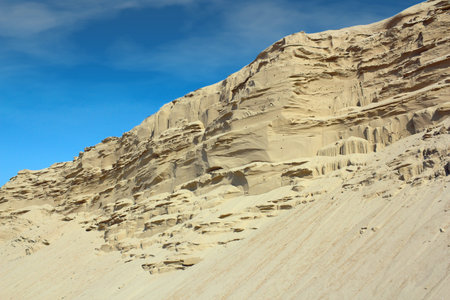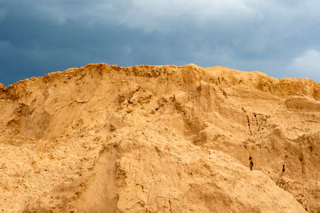 Industrial sand quarry. Sand pit. Construction industry. Sand hill agains the blue sky.