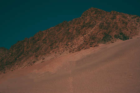 Huge desert dunes in Hammada desert Egypt with rocky mountain scenery. Great place for photographers and travelers. Beautiful sandy barkhan structures. Hammada desert landscape. Egypt. South Sinai.