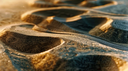 Close-up of golden sand dunes with gentle ripples, illuminated by soft sunlight creating a bokeh effect.