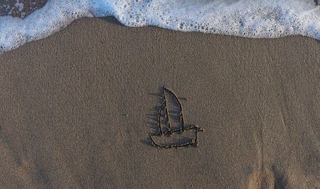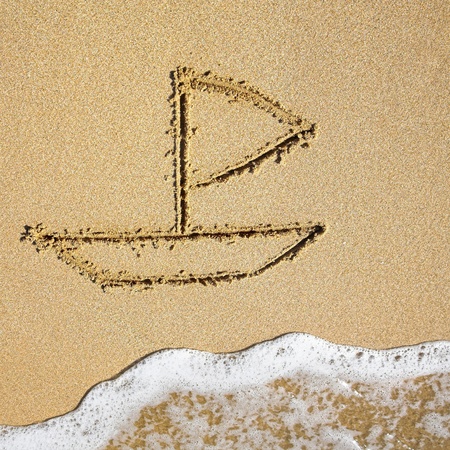 Sailboat drawn in the sand on the seashore.