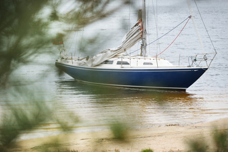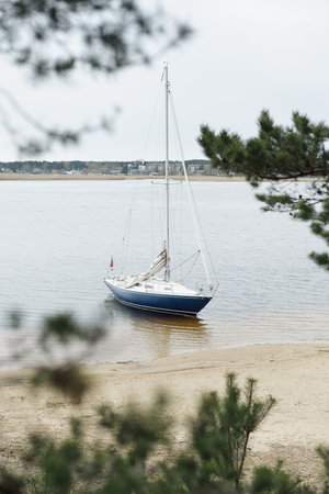 Yacht anchored in the shallow water near the sandy beach and evergreen forest, close-up. Lule river, Sweden. Travel destinations, sport, amateur recreational sailing
