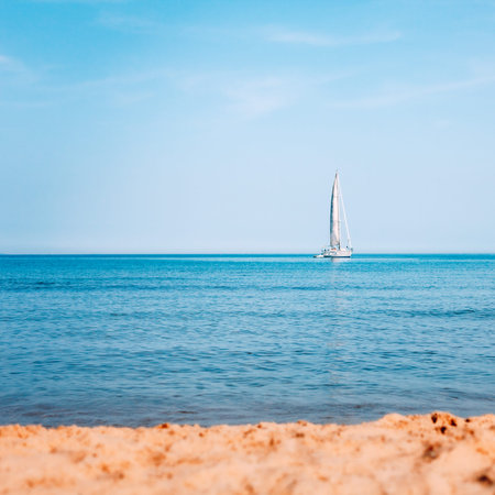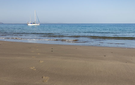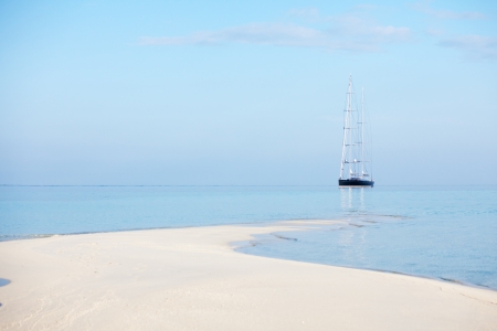 Beautiful white yacht in blue sea. Calm sea, sunny day. Sandy shore in foreground. Desert seascape