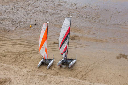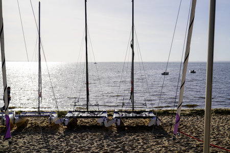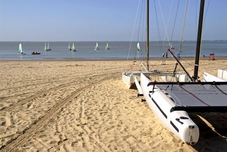 multihull trimaran charter school boats on the sandy beach in Cap Ferret in arcachon basin bay