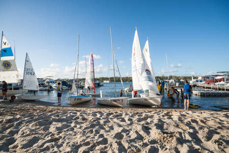 NOOSA, QUEENSLAND, AUSTRALIA - MARCH 11, 2014; Young sailors pull their yachts out of the water on March 11, 2014 at Noosa, Australia