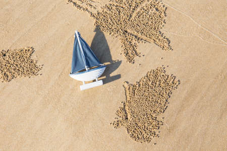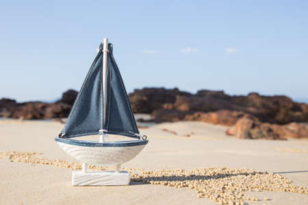 ship toy model in the sand on the beach.
