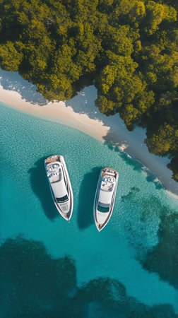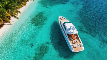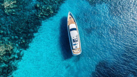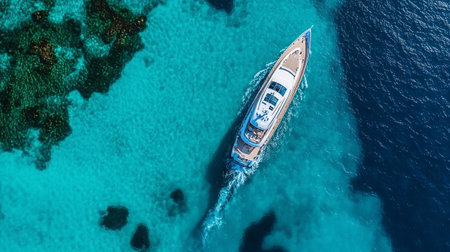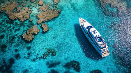 Luxury yacht cruising through vibrant turquoise waters above a stunning coral reef