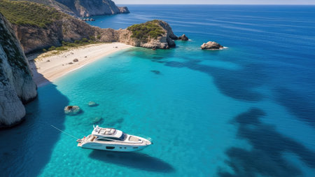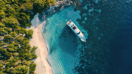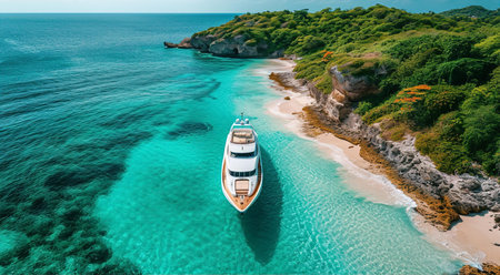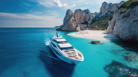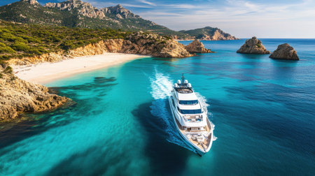 Aerial view of luxury yacht in turquoise sea water.