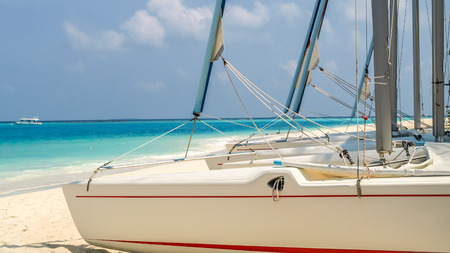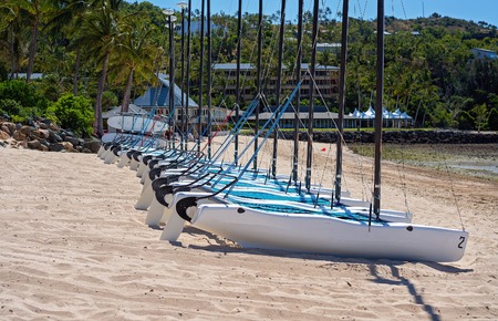 A row of catamarans for hire to guests on the sandy beach of a tropical island resort