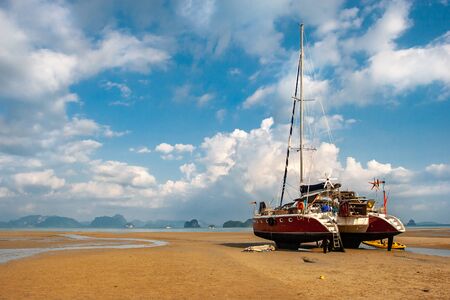 A large catamaran yacht stands on a sandy shore without water. On the blue sky there are beautiful clouds, sunny. In the distance, rocks are visible in the sea.