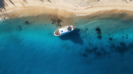 Aerial view of luxury yacht in turquoise sea. Top view