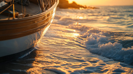 Bow of the sailing vessel with anchor chain at sunrise