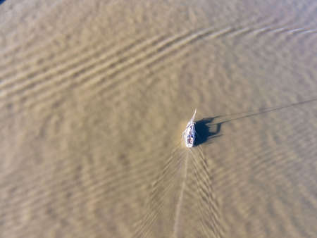 Aerial view of a small touristic motor boat sailing in the green water of Tagus river near Lisbon Marina harbour, Lisbon, Portugal.