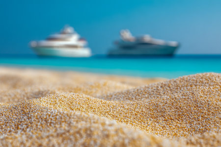 Tiny golden grains sparkle under sunlight, contrasted by distant elegant yachts gently drifting on vibrant turquoise waves beneath a clear sky.