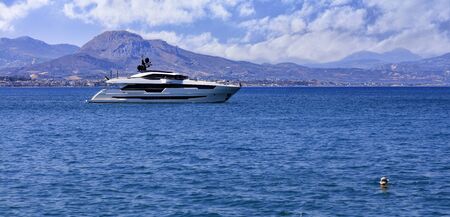 Private luxury super yacht anchored outside Heraklion harbor in the Aegean Sea. Heraklion Crete, Greece. Luxury lifestyle travel yachting concept.
