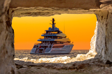 Luxury yacht on golden sunset through stone window view