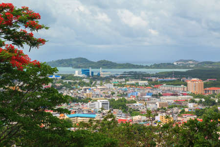 Bird eye view of Phuket cityscape with blue sky background, Thailand