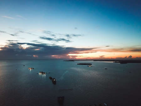 Aerial view of beautiful landscape near the island and sea gypsy water village with the water chalet stilt house during sunrise in Bum Bum island Semporna, Sabah, Malaysia.
