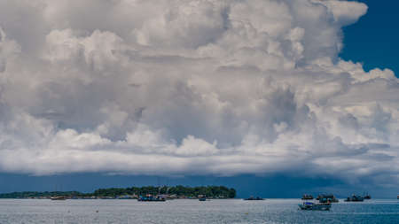 Sandakan. Malaysia. November 27, 2018. A view of the shore in the city, which is interspersed with marinas, ships and huts of gypsy fishermen on stilts.