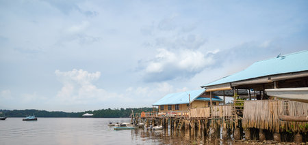Traditional houses on stilts over the water. Sandakan city, Borneo, Sabah, Malaysia