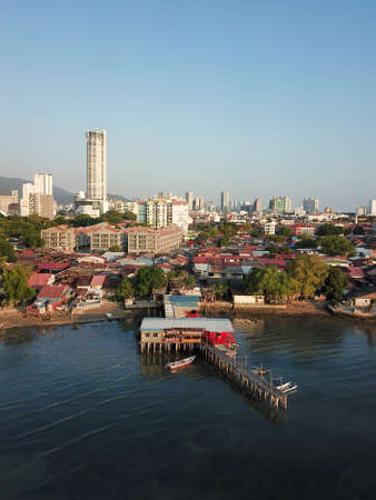 George Town, Penang/Malaysia - Jun 25 2017: Aerial view old heritage house near the sea.