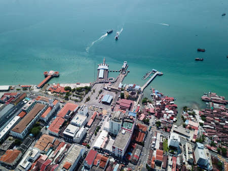 Georgetown, Penang/Malaysia - Mar 17 2020: Aerial view ferry move near the terminal at Georgetown.