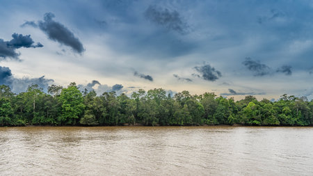 A calm river in a tropical rain forest. Ripples on brown water. Tickets of green jungle trees on the shore. Blue evening sky, clouds. Malaysia. Borneo. Kinabatangan River.