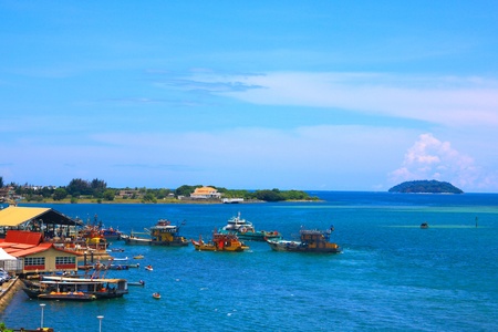 SANDAKAN. MALAYSIA. November 26, 2018. Small fishing boats with fresh catch of sea fish rush to the fish market.
