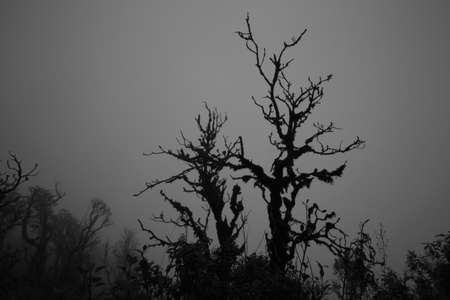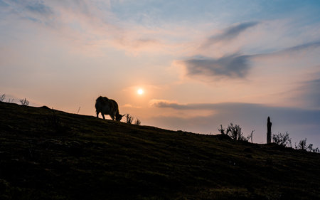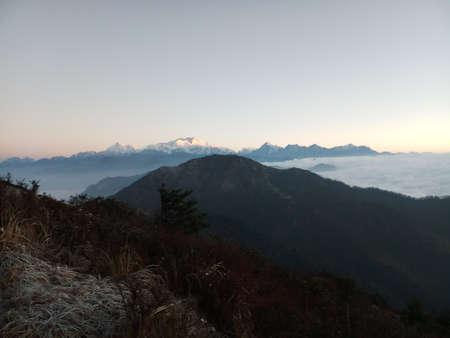 View of Himalayas mountain range with visible silhouettes through the colorful fog from Khalia top trek trail. Khalia top is at an altitude of 3500m himalayan region of Kumaon, Uttarakhand, India.