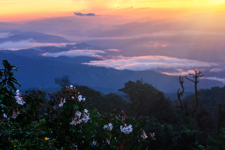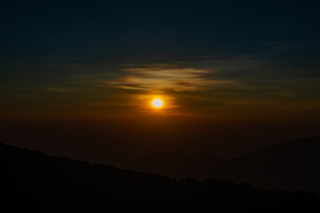 The beautiful sunrise at Doi intanon national park, Chiang Mai in the morning. Sun is rising from the hill to sky with beautiful yellow orange light.