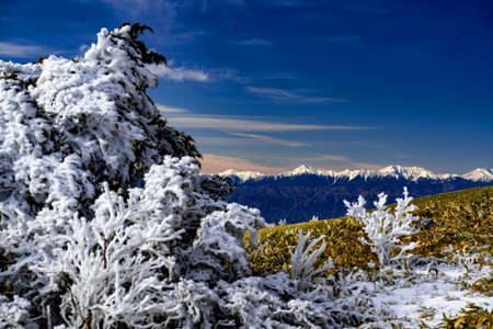 The view from the Dochula Pass In the background are the snow covered mountains, in the foreground are some hemlocks