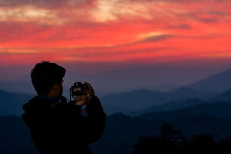 Silhouette of photographer with camera taking picture of beautiful sunset on the mountain
