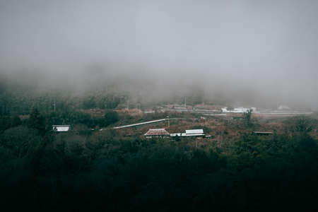 Beautiful autumn landscape with foggy trees and houses in the fog