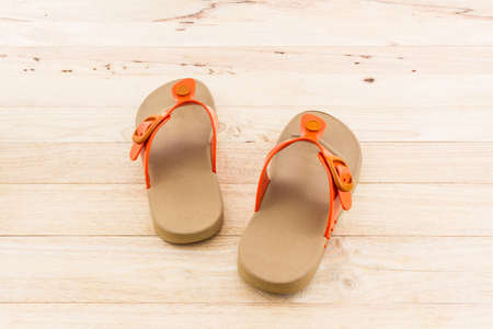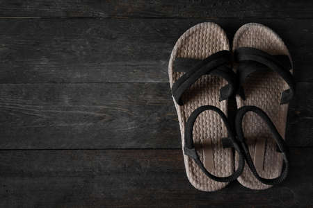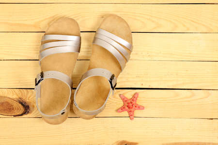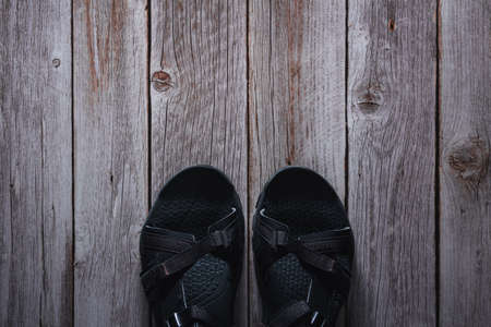 Summer sport sandals on wooden bottom. Accessory. Copyspace. Selective focus.