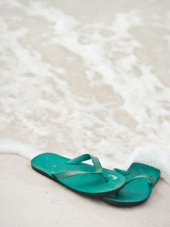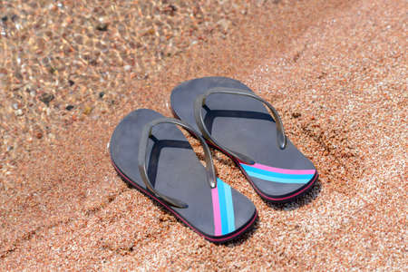 Colorful flip-flops on the sand. The shore of the Indian ocean